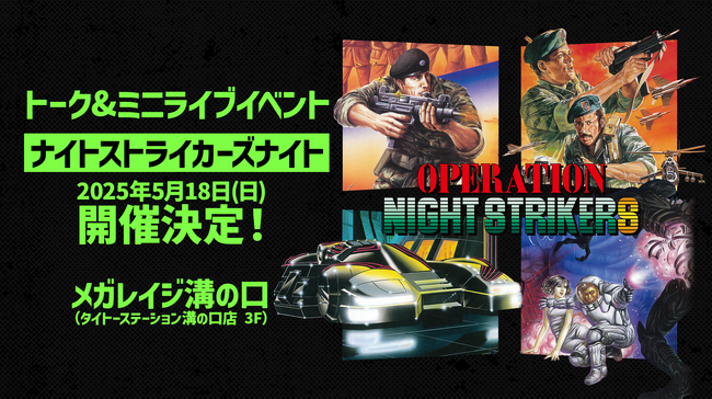 株式会社タイトー(本社:東京都新宿区、以下タイトー)は、『オペレーション・ナイトストライカーズ』や関連タイトル情報を配信するトーク&ミニライブイベント「ナイトストライカーズナイト」を2025年5月18日(日)に開催いたします。また、イベントの開催を記念してオリジナルアクリルスタンドやAmazonギフトカードが当たるプレゼントキャンペーンも実施いたします。