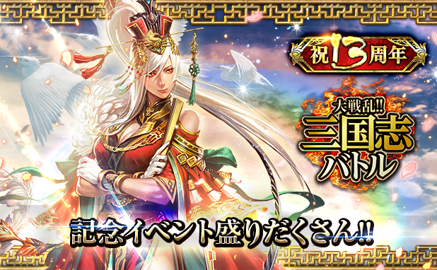 リアルタイムバトルゲーム「大戦乱!!三国志バトル」が13周年!皆さまのご愛顧に感謝し「祝!!13周年記念イベント」を開催