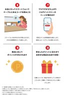 国内全店舗のテーブルに設置された二次元バーコードをスマートフォンで読み取ることで付与されるポイント数に応じて、オリジナル商品と交換できます。