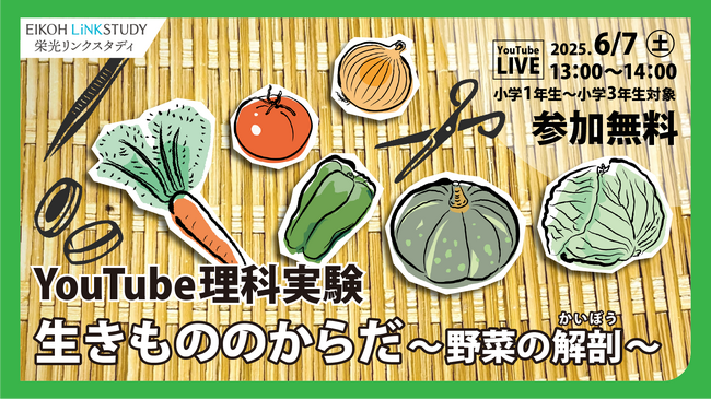 株式会社増進会ホールディングス(Z会グループ)のグループ会社、株式会社栄光(本社:東京都千代田区 代表取締役社長:下田勝昭)が運営するオンライン進学塾「EIKOH LiNKSTUDY(栄光リンクスタディ)」は、小学1・2・3年生対象のYouTube理科実験「生きもののからだ~野菜の解剖~」を、2025年6月7日(土)13:00~14:00に無料開催します。