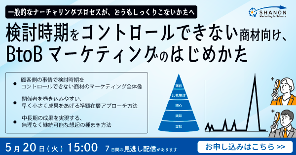 株式会社シャノン(本社:東京都港区、代表取締役CEO:山崎 浩史)は、5月20日(火) に「検討時期をコントロールできない商材向けのBtoBマーケティング」をご紹介するウェビナーを開催いたします。