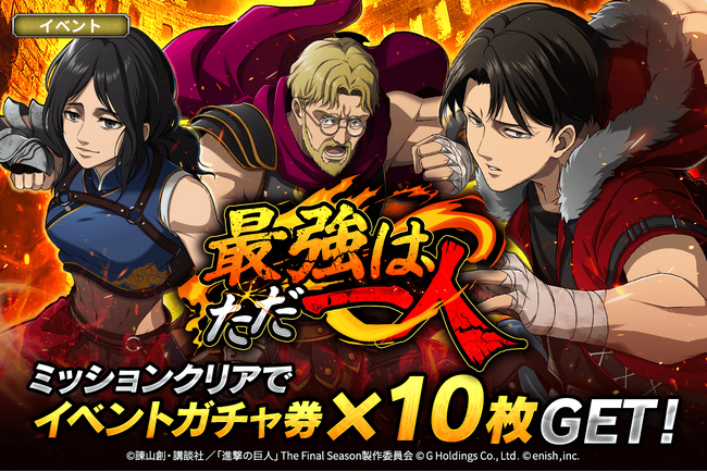株式会社enish(本社:東京都港区、代表取締役社長:安徳 孝平、以下enish)は、アニメ『進撃の巨人』のスマートフォンゲーム最新作「進撃の巨人Brave Order」にて、2025年5月15日(木)より、「最強は、ただ一人」を開催!また、本日より新登場の【拳闘士】リヴァイ、【拳闘士】ジーク・イェーガー、【拳闘士】ピーク・フィンガーがピックアップされた「最強は、ただ一人ガチャ」も開催!その他、最新情報はゲーム公式サイト・ゲーム公式X(旧Twitter)アカウントにて随時公開して行きますので、ぜひご覧ください。