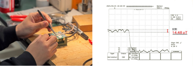 「JIKAI-M」の開発風景(左)、センサ感度のオシロスコープ波形画像(右)