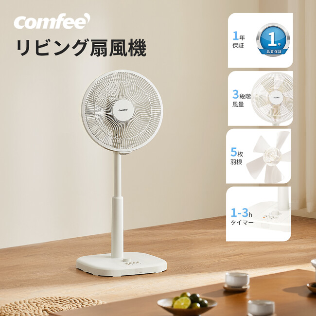 COMFEE'のリビング扇風機は、静音設計と左右自動首振り機能を備え、上下角度調節や3段階の風量調整が可能。