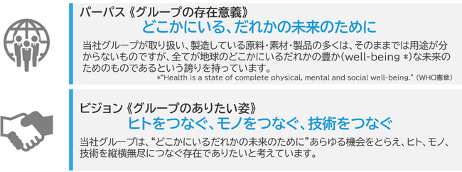 この節目の年にあたり、グループ内においては指針として共有するため、外部ステークホルダーの皆さまにはグループのありようを示すため、グループの存在意義としてのパーパス「どこかにいる、だれかの未来のために」とグループのありたい姿としてのビジョン「ヒトをつなぐ、モノをつなぐ、技術をつなぐ」を策定しました。