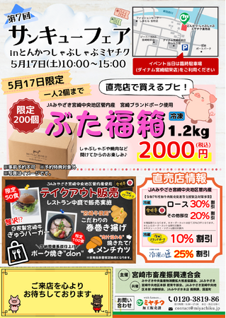 株式会社ミヤチク(本社:宮崎県都城市/代表取締役社長:船ヶ山 祐二)が運営する【とんかつしゃぶしゃぶ】にて、5月17日(土)に「第7回 サンキューフェア」が開催されます。イベント当日限定で〈200個限定〉ぶた福箱を販売いたします!その他、宮崎牛ロース30%OFFなど直売店での特売やこだわりのテイクアウト販売も実施!