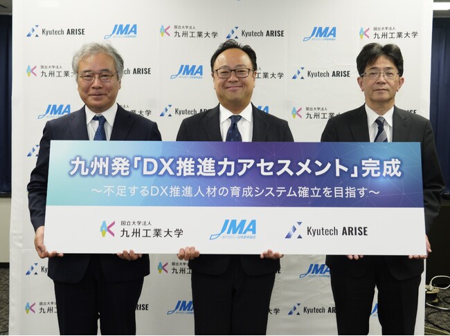 一般社団法人日本能率協会(東京都港区芝公園、会長:中村正己、以下:JMA)と国立大学法人九州工業大学(福岡県北九州市、学長:三谷康範、以下:九工大)、株式会社Kyutech ARISE(福岡県飯塚市、社長:嶺正二郎、以下:Kyutech ARISE)は、DX推進力の定性的評価を測る「DX推進力アセスメント」を開発いたしました。2025年5月15日(木)、福岡市内で三者共同の完成記者発表会を開催し、開発の経緯や本アセスメントの特長を伝えるとともに、「2025年の崖」といわれる、DX推進の取り組み不足による経済損失の危機に対して、九州発の新ツールで挑んでいく考えを示しました。「DX推進力アセスメント」は2025年内から提供を開始する予定です。