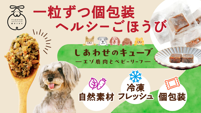 その第一弾商品として、北海道産エゾシカに加え、自社有機農場で栽培したベビーリーフなどを使用した、無添加・冷凍・個包装のフレッシュフード『しあわせのキューブ』を開発。