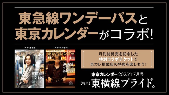 本チケットは、2025年5月21日(水)発売の「東京カレンダー」7月号で企画される「東横線プライド。」の特集にあわせ、東横線の魅力を実際に体感いただくことを目的に発売するもので、同誌に掲載される東横線沿線の飲食店12店舗でのワンドリンクサービス※2の特典と、東急線が1日乗り降り自由な「東急線ワンデーパス」がセットになったおトクなチケットです。