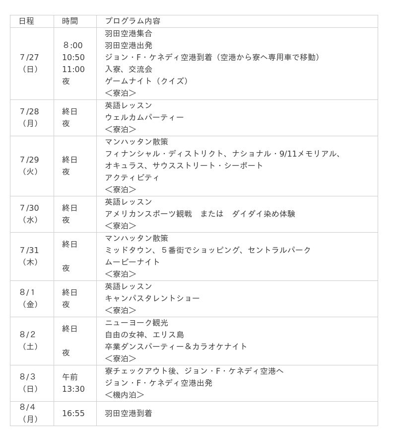■【引率同行グループツアー】ニューヨークエンバシー・サマープログラム 9日間 概要