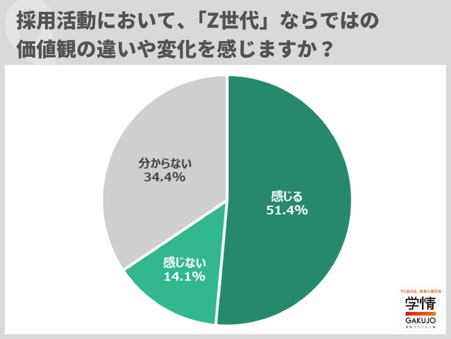 株式会社学情(本社:東京都中央区)は、企業・団体の人事担当者を対象に、「20代を対象とした採用活動」についてのインターネットアンケートを実施しました。20代の採用活動で「Z世代」ならではの価値観や他の世代との違い・変化を感じるかを尋ねたところ、「感じる」と回答した企業が51.4%に上り過半数を占めました。具体的には「キャリアや成長に対する意識が明確」「成長意欲は高いが受け身」「社会貢献への意欲が高い」「ワーク・ライフ・バランス重視」「タイパ重視」「マニュアルがないとできないが、トリセツがあるととても素直に作業する」「会社への帰属意識が希薄」「転職が当たり前」といった特徴をあげる声が寄せられました。応募者との接触率を高めるための取り組みについては、「選考案内を迅速に行う」が突出して高い数値に。内定承諾率向上のための取り組みでは、「入社時期を柔軟に対応する」が最多でした。