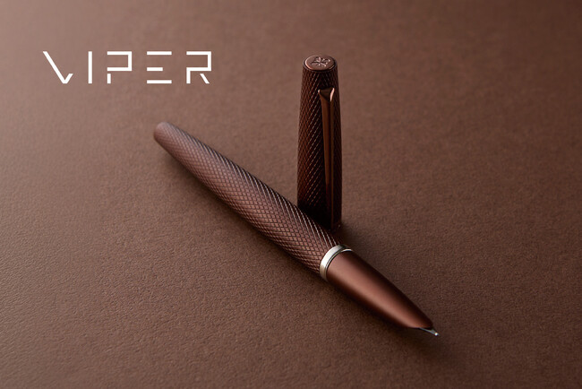 VIPER(バイパー)は、ギロシェパターンの彫刻だけでなく、アノダイズ加工のメタリックな風合いの仕上げとも好相性となっており、流線型のフォルムはボディ、グリップ、そして精緻に設計され滑らかな書き味を発揮するフーデッドニブへと一体感のある曲線を描きます。従来使用していた14金ペン先(エクセレンスA2、アエロなど)をステンレスにすることで価格を抑え、初めての万年筆としても最適なアイテム。機械で代えることの出来ない熟練による手作業で作り上げられたVIPERは、ブラウンの登場により、ブラウン/ブルー/ブラックの3色から自分のスタイルに合わせて選択できるようになります。[画像2: https://prcdn.freetls.fastly.net/release_image/28883/98/28883-98-a4007050caa03411439f9a89f972845e-2000x721.jpg?width=536&quality=85%2C75&format=jpeg&auto=webp&fit=bounds&bg-color=fff ]