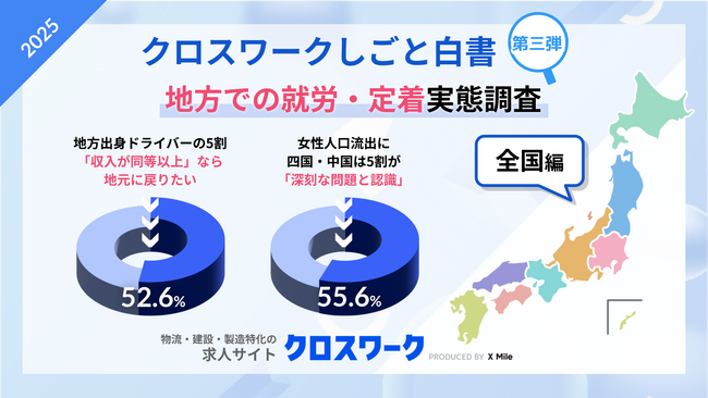 ノンデスク事業者向けの人材採用システム『クロスワーク』を提供するX Mile株式会社(読み:クロスマイル、本社:東京都新宿区、代表取締役:野呂 寛之、以下『当社』)は、物流業界の働き方に関する実態調査「クロスワークしごと白書2025」の第三弾として、『地方での就労・定着』に関する独自調査をこの度、発表しました。本調査は、全国の物流事業の経営者・役員185名と、トラックドライバー720名(*)の計905名を対象に実施した独自アンケートの調査結果をまとめたものです。