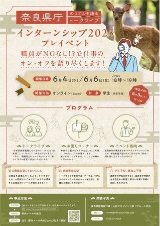 奈良県庁では、サマーインターンシップに先立ち、オンラインのプレイベントを開催します。 リクルート担当によるトークライブを通して、奈良県庁のあれこれ、仕事のオン・オフなどをお話しします! 公務員を意識している人も、そうでない人も、ぜひご参加ください。皆さまのご参加を心よりお待ちしています!