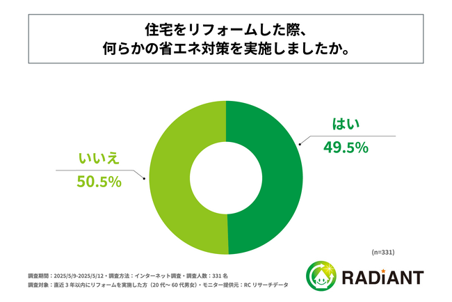 直近3年以内に住宅をリフォームした人の約半数が、省エネ対策を実施している!株式会社ラディエントが「住宅リフォームに伴う省エネ対策に関する実態調査」を実施!