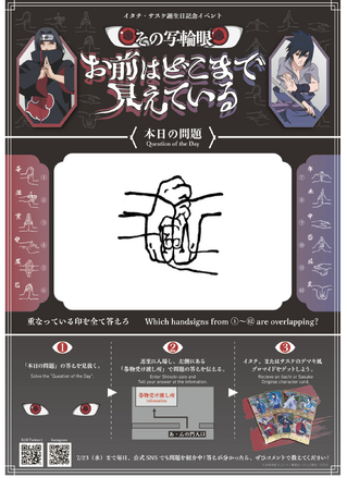 うちは兄弟の誕生日をお祝いし、イタチの誕生日である6月9日からサスケの誕生日である7月23日までの期間限定で開催される解読イベント。アトラクション入口に掲示される複数重なりあった印を読み解くゲームに挑戦し、見事に読み解いた方には、「NARUTO&BORUTO 忍里」限定のゲマキ風オリジナルブロマイド「サスケ」と「イタチ」から、お好きな方をプレゼント