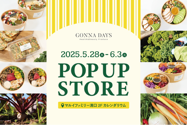 Mr. LAND株式会社(所在地:東京都千代田区、代表取締役社長:名塚 令)が運営するインナービューティーブランド「GONNA DAYS(ゴナデイズ以下)」は、2025年5月28日(水)~6月3日(火)の期間限定で、神奈川県のマルイファミリー溝口にて2回目となるPOP UP STOREを開催いたします。2025年2月に初開催した際には、ブランドのコンセプトと、ヘルシーで美味しいサラダを中心としたメニューが多くの方のご好評をいただき、連日完売が続くなど大きな反響をいただきました。お客様のご期待にお応えし、今回再び「マルイファミリー溝口」への出店が決定いたしました。前回人気を集めたサラダ、カリーノケールを主役にしたお総菜パウンドケーキ・ケークサレに加え、新たに照り焼きチキンと3種の和惣菜を載せたサラダがPOP UP STOREに登場し、よりパワーアップしたラインナップでお届けいたします。