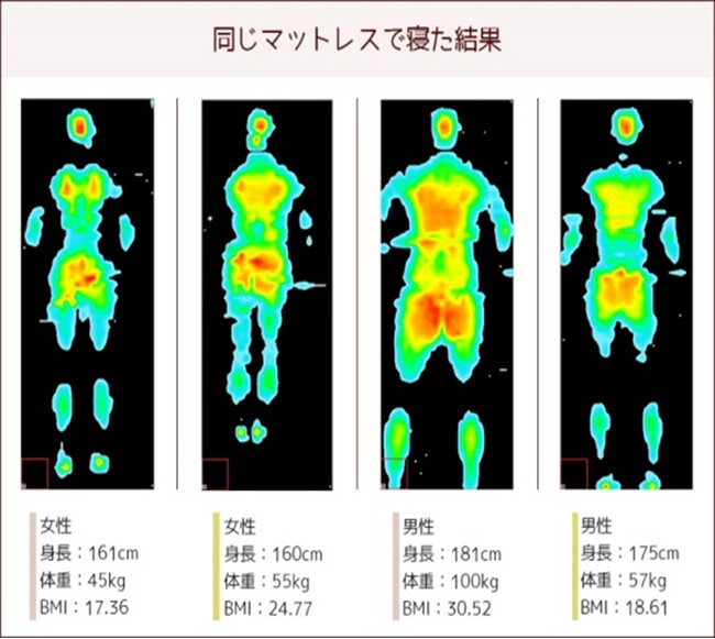 マットレスの体圧分散性が使用するユーザーによって違うことは当然のことですが一般にはあまり知られていません。身長185cm、体重90kgの大柄な男性と身長150cm、体重45kgの小柄な女性が同じマットレスに寝たときの体圧分散性が同じになるはずがありません。