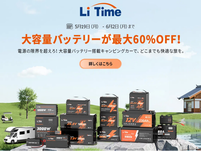 リタイムのサブバッテリーセール開催中!キャンピングカーや車中泊に最適な人気モデルが最大60%OFF。今だけのお得なチャンスをお見逃しなく。