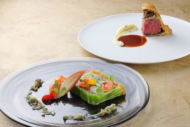 手前より:前菜、肉料理(「オークラフレンチの夕べ」~シェフ達が紡ぐ美食のストーリー~ 第1回より)