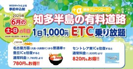 愛知道路コンセッション株式会社(代表取締役社長:柘植 浩史)は、2025年6月の土日限定で、知多半島の有料道路(知多半島道路、南知多道路、知多横断道路、中部国際空港連絡道路)と猿投グリーンロードにおいて、利用予定日の2営業日前までに事前申込された方を対象に1日1,000円のETC乗り放題企画を実施いたします。知多半島には豊かな海産物や魅力的な観光スポットが多くあり、お客様に知多半島の魅力を深く知ってもらうことが目的です。対象路線内で何度乗り降りしても1日1,000円となるお得な企画となっておりますので、是非ご利用ください。