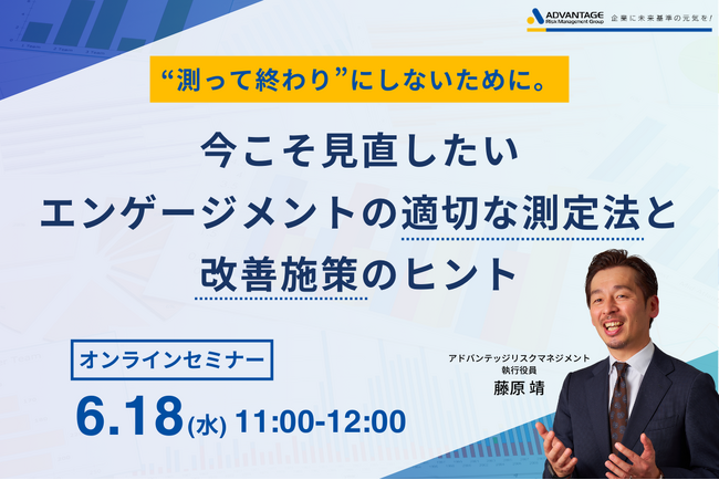 株式会社アドバンテッジリスクマネジメントは、2025年6月18日(水)にエンゲージメント領域のご担当者様、健康経営の実務担当者様/責任者様を対象としたWebセミナー「“測って終わり”にしないために。今こそ見直したいエンゲージメントの適切な測定法と改善施策のヒント」を開催いたします。