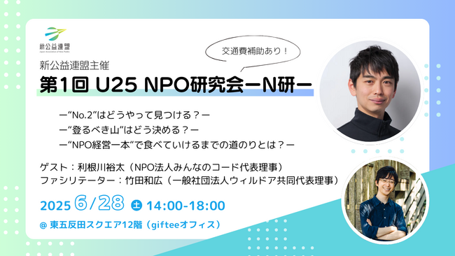 - 【受講者募集】新公益連盟 次世代育成プロジェクト 『U25NPO研究会-N研-』・『NPO経営塾』 受講者募集のお知らせ05/26 12:00