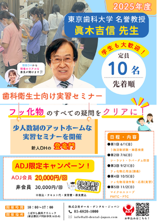 株式会社オール・デンタル・ジャパン【ADJ】(代表取締役:木下英明・廣田祥司)はDH向けハンズオンセミナーを、2025年6月1日(日)に開催致します。