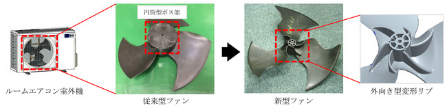 従来型ファン(左)と中央部に変形リブを設けて軽量・高効率化を達成したプロペラファン(右)