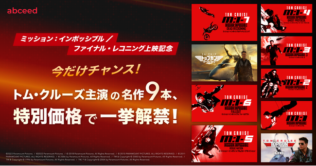 株式会社Globee(本社:東京都港区、代表取締役:幾嶋研三郎)が提供する、AI英語学習アプリ「abceed(エービーシード)」は最新作『ミッション:インポッシブル/ファイナル・レコニング』の公開を記念して、英語学習機能付き映画視聴サービスにて、『ミッション:インポッシブル』シリーズと『トップガン』シリーズ(全9作品)を、特別価格でお楽しみいただける英語学習キャンペーンを5月28日(水) より開催いたします!