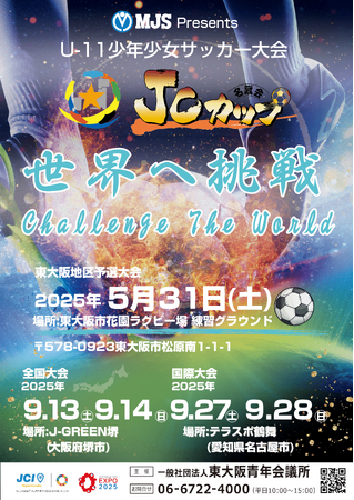 一般社団法人東大阪青年会議所(以下、東大阪JC)は、地域の未来を担う子供たちの成長と地域の絆を深めることを目的に、「第1回 JCカップ東大阪地区予選大会 2025」を開催いたします。本大会では、東大阪市から選抜された少年サッカーチームが出場し、白熱した試合を通じて、子供たちが主役となって輝く場を創出します。また、大会を通じて地域の一体感を高め、スポーツを通じたまちづくり運動の推進をめざします。JCカップ当日は、隣接する花園ラグビー場第1グラウンドにて、東大阪を拠点に活動するFC大阪のホームゲームも開催されます。また、花園中央公園では、地域の様々な団体によるブース出展もあり、ご来場の皆様に広く楽しんでいただける内容となっております。皆様のご取材・ご来場を心よりお待ちしております。