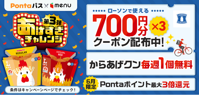 今回の「あげすぎチャレンジ」第3弾では、対象期間中にmenuでローソン商品をご注文いただくと、からあげクンを1食無料でプレゼント※。さらに商品代金1,700円以上の購入で使える700円割引クーポンを毎週3枚配布します。また、2025年6月3日~2025年6月30日の期間中、Pontaポイント還元率が通常の最大3倍に、さらにauPAY決済の場合最大4倍に増量します。