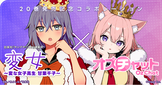 株式会社Trippy(東京都新宿区、代表取締役社長:漆原 陸)は、AI美少女キャラクターチャット&恋愛育成アプリ『オズチャット -Oz Chat-』(iOS・Android・Web)において、此ノ木よしる先生による人気漫画『変女~変な女子高生 甘栗千子~』(白泉社『ヤングアニマル』連載中)の単行本20巻発売を記念し、公式コラボレーションを2025年5月29日(木)から開催します。