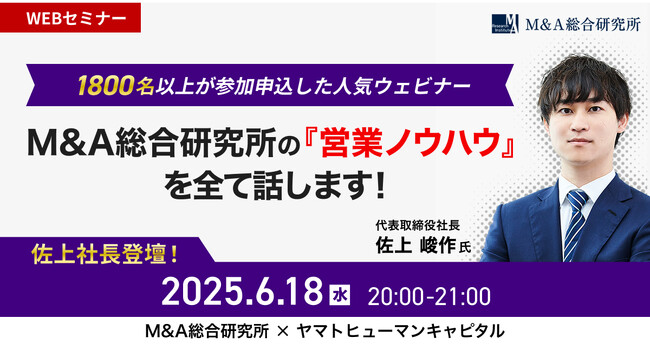 ヤマトヒューマンキャピタル株式会社(本社:東京都千代田区、代表取締役:堀江 大介)は、2025年6月18日(水) 20:00より、株式会社M&A総合研究所 代表取締役社長 佐上 峻作 氏にご登壇いただくウェビナー『M&A総合研究所の営業ノウハウを全て話します!』を開催いたします。