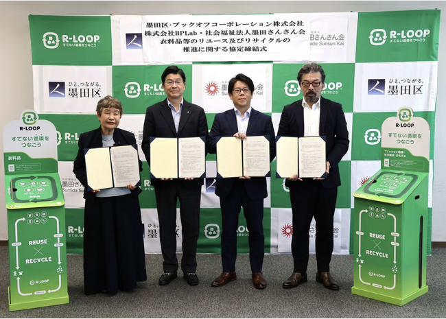 繊維製品の回収・再生の循環プラットフォーム「BIOLOGIC LOOP(ビオロジックループ)」を運営する株式会社BPLab(ビーピーラボ、所在地:東京都港区、代表取締役:八代 直樹、以下BPLab) は、衣料品のリサイクルと雑貨品のリユースによって、“すてない選択”を提供し、循環型社会の実現をより身近に感じていただくことを目的に、ブックオフコーポレーション株式会社(本社:神奈川県相模原市、代表取締役社長:堀内康隆、以下ブックオフ)と共同企画・運営するボックス型不要品回収システム「R-LOOP(アールループ)」を活用し、東京都墨田区(区長:山本 亨)、社会福祉法人墨田さんさん会(理事長:前田 君代)と衣料品等リユース及びリサイクルの推進に関する4者連携協定を2025年5月28日(水)に締結しました。R-LOOPを活用した連携協定は東京都の自治体では初となります。