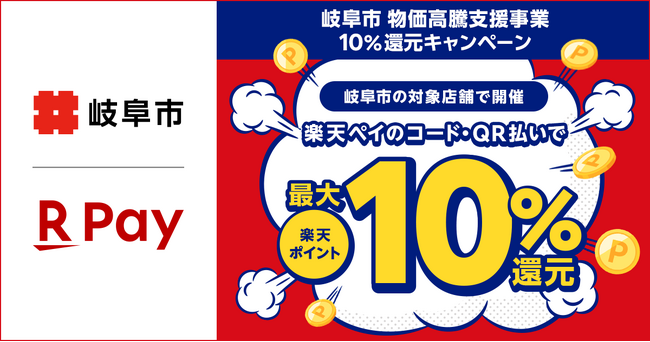 楽天ペイメント株式会社(以下「楽天ペイメント」)は、運営するキャッシュレス決済サービス「楽天ペイ」において、岐阜県岐阜市が2025年6月1日(日)から6月30日(月)まで実施する「岐阜市物価高騰支援事業10%還元キャンペーン」に参加することをお知らせします。