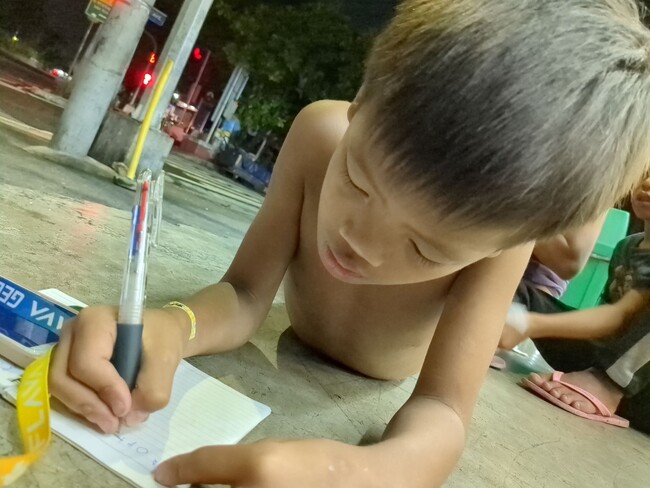 コンビニの明かりを頼りに、路上で文字の練習をする子ども