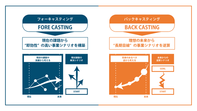 1. バックキャスティング思考による「未来の提供価値」の創出数年後、あるいはもっと先の未来に「こうありたい」という理想の姿を描き、その未来の姿から逆算し「今、何をすべきか」と考えることが“バックキャスティング”という思考法です。この思考方法を用いることで、目の前の課題にとらわれることなく、本当に大切にすべき価値に気づくことができます。(本プロセスは、「BRAND BOOST METHOD:未来事業クリエイティブ」として昨年リリース済みです。)