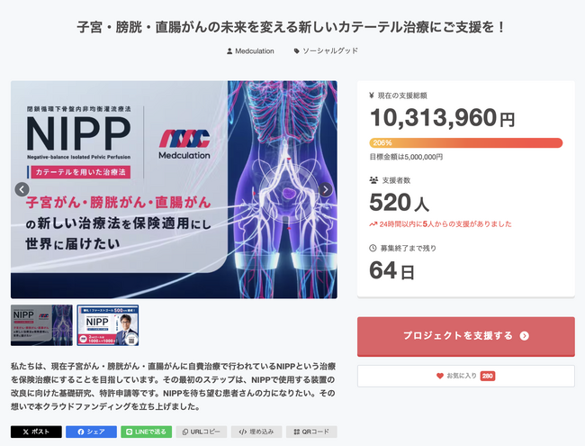 医療系ベンチャー企業として発足したメドキュレーション株式会社(本社:静岡県/代表取締役:柴垣知広)は、子宮がん・膀胱がん・直腸がんに関する治療法であるNIPP(閉鎖循環下骨盤内非均衡灌流療法)の保険適用化を目指す活動の一環として、クラウドファンディングプラットフォーム「CAMPFIRE」にて支援を募っています。