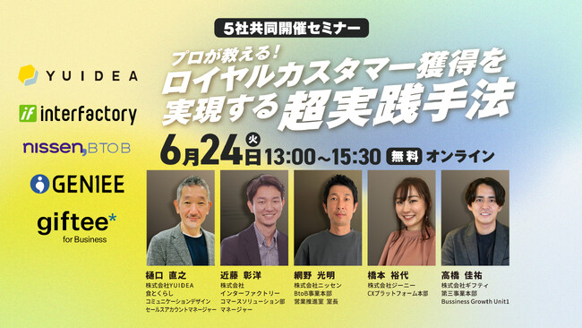 株式会社YUIDEA(本社:東京都港区 代表取締役社長 細矢和宏)は、株式会社インターファクトリー、株式会社ニッセン、株式会社ジーニー、株式会社ギフティと5社共催により、通販事業、EC事業、D2C事業の共通課題に対し無料セミナー「プロが教える!ロイヤルカスタマー獲得を実現する超実践手法」を2025年6月24日(火)にオンラインで開催いたします。