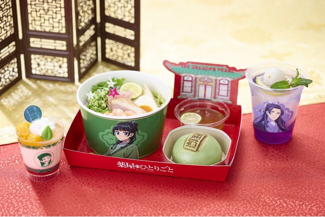 「猫猫(マオマオ)」のカラーである“緑色”をベースにした『猫猫の彩りスダチ冷麺コンボ』は、さっぱりしたスダチの香りが広がる翡翠冷麺と、山椒のアクセントが“薬師”を感じ、「猫猫」の焼き印が入ったまんを 味わえるコンボメニューとなります。デザートには、薬草を見つけてにやにやが止まらない、「猫猫」を目印にした『猫猫の莓杏仁豆腐 黄桃添え』が登場します。「猫猫」が大好きな薬草をイメージしたリーフチョコをトッピング。さらに、「壬氏(ジンシ)」のカラーとなる“紫色”の美しいグラデーションが印象的な『壬氏のライチ香るシトラスドリンク』もラインナップ。優雅で気品あふれる「壬氏」を表現したドリンクは、ライチの 爽やかな風味づけで、暑い季節にぴったりの内容に仕上げました。