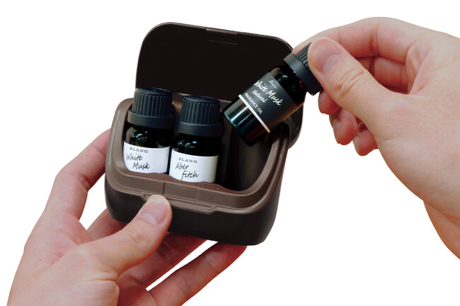 また、ユーザーからの「車での置き場所に悩む」という声を受け、複数のボトルを収納できる、耐香料素材を採用したオイルケースを開発しました。車内に置きやすいサイズと形状で、使いたいオイルの持ち運びに便利です。