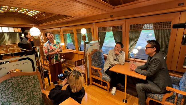 「THE ROYAL EXPRESS」は、列車好きなら知らぬ者はいない、デザイナーの水戸岡鋭治さんがデザイン。木の温かみを存分に生かした内装は、どこかノスタルジックな雰囲気も感じさせる。礼二も「水戸岡さんの列車は何度か乗ったことはあるけど、特に水戸岡さんの技術というかアイデアが詰まった列車だなと思いますね」と惚れぼれ。そんな豪華列車を、今回は何と番組のために貸し切り運行してくれているという。最高の贅沢だ。