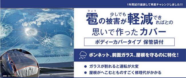 株式会社オートアールズ(本社:埼玉県本庄市 / 代表取締役社長:野田晋作)は『雹の被害が少しでも軽減できればとの思いで作ったカバー』の販売を開始致します。