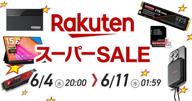 国内でストレージ商品や、PCパーツ及び周辺機器の開発・販売を行っているMonster Storageは、2025年6月4日(水)20:00から楽天市場で開催される「楽天スーパーSALE」にて特別セールを実施。