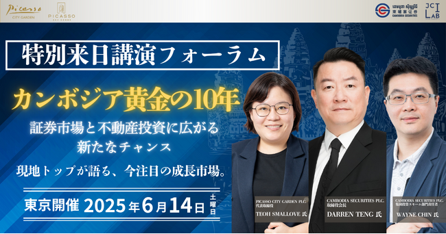JCI LAB CO., LTD(本社:プノンペン、代表:ヤン・ファン)は、2025年6月14日(土)に東京・紀尾井カンファレンスにて開催される特別来日講演フォーラム「カンボジア黄金の10年 ~証券市場と不動産投資に広がる新たなチャンス~」に共催いたします。