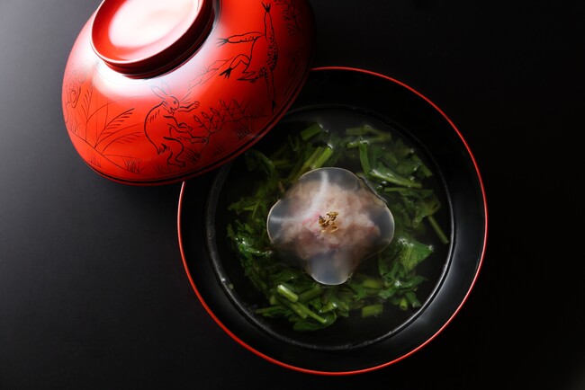 旬の毛蟹を紹興酒と日本酒に漬けこみ、酔っ払い蟹にした後に蒸しあげた、香り高いほぐし身を真丈に仕立てた一品です。中華料理から着想を得て、食感の良い空心菜を合わせました。弾力のある板蕨(わらび)と、柑橘を思わせる爽やかな香りが特徴のネパール山椒を加えることで、より蟹の甘みが引き立ち、夏らしさと遊び心を感じられます。