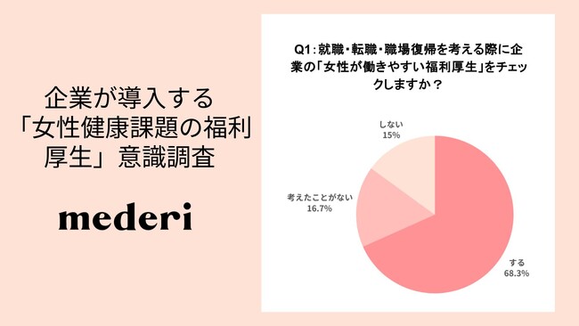 オンラインピル診療サービス『mederi Pill(メデリピル)』を提供するmederi株式会社(本社:東京都目黒区、代表取締役 坂梨 亜里咲 以下、mederi)は、mederi公式X・Facebook、LINE会員である女性60名を対象に、企業が導入する「女性健康関連の福利厚生」に関する意識調査を実施しました。