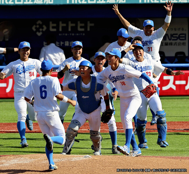 昨年の第73回大会では、青山学院大学(東都大学)が本大会2連覇を達成し、6回目の優勝を飾りました。今年は3連覇を目指す青山学院大学(東都大学)をはじめ、東京六大学春季リーグ戦の優勝決定戦を勝ち抜き、2大会連続の出場権を獲得した早稲田大学、初出場の聖カタリナ大学(四国地区大学)、久留米工業大学(九州地区大学)や、2大会連続20回目の出場となる上武大学(関甲新学生)、昨年大会ベスト4の東日本国際大学(南東北大学)、2018年大会に優勝経験のある東北福祉大学(仙台六大学)など、初出場から常連校まで全国27大学野球連盟の春季リーグ戦を勝ち抜いた代表校が、大学日本一の座をかけて熱い戦いを繰り広げます。