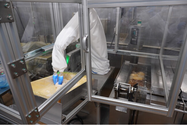 連続式フライヤーにフライ食材(魚フライ、唐揚げ、コロッケ、とんかつ等)を投入し続ける作業は、高温多湿環境下で、かつ、油分も多く、人が仕事をし続けるには非常に酷な環境と言えます。一定の数量をムラのない仕上がり状態で調理するためには、特に投入口付近に人を長時間配置し、等間隔で投入し続けることが求められることが多く、食品工場の中でも自動化優先度の高い工程でもあります。今回の展示では、フライヤーに食材を投入するロボットを展示します。視触覚機能を有するロボットハンドを実装しており、様々な食材・不定形な具材を同じロボットで汎用的にハンドリングできます。使い方はシンプルで、番重に食材を入れてスタートボタンを押すだけであり、過酷な環境下における単調な繰り返し作業を自動化できるため、多くのお客様より関心・引き合いを頂いております。
